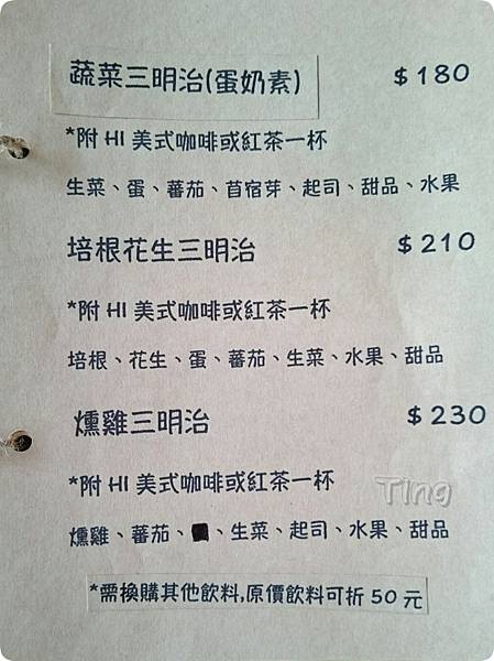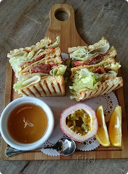 培根花生三明治-210元(培根、花生、蛋、蕃茄、生菜、水果、甜品)