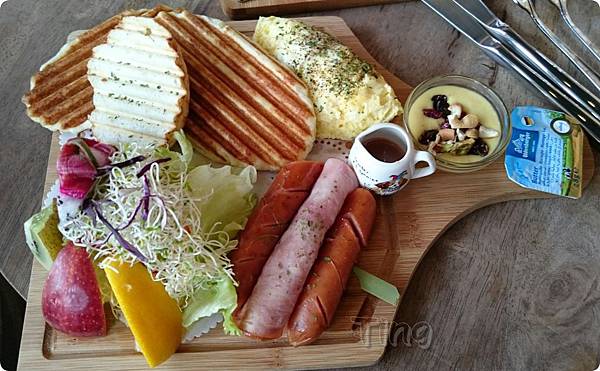 (網狀火腿、德式香腸、手工煎餅、起司牛奶蛋、生菜沙拉、水果、甜品)