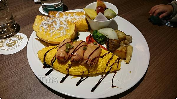 含煙燻鮭魚、歐姆雷克蛋捲、炒薯塊、烘烤時蔬、水果沙拉