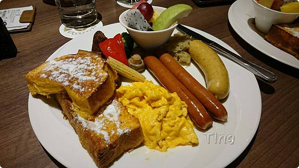 法蘭克腸、起士腸、起士嫩蛋、炒薯塊、烘烤時蔬、水果沙拉