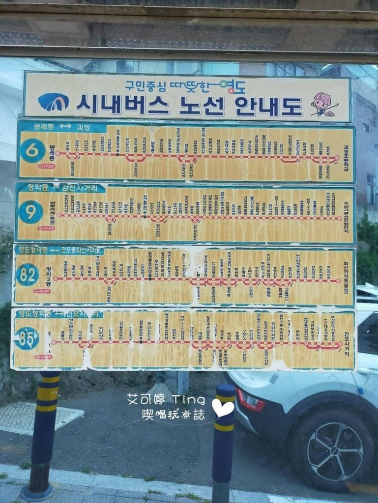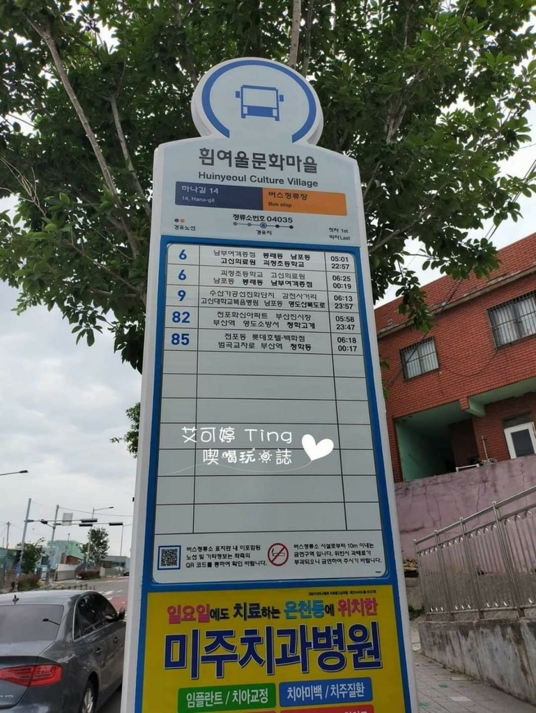 1號線 111 【南浦站 남포역】 6號出口,轉搭6、7、9、70、71公車,在白淺灘文化村(흰여울문화마을)站下車