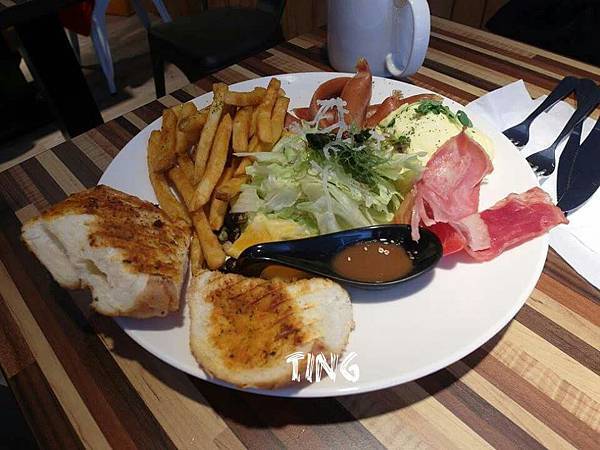 含法國麵包+德國香腸X2+培根+蛋捲+沙拉+薯條