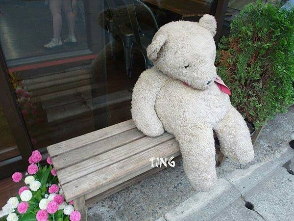 門口坐了隻可愛的大熊布偶
