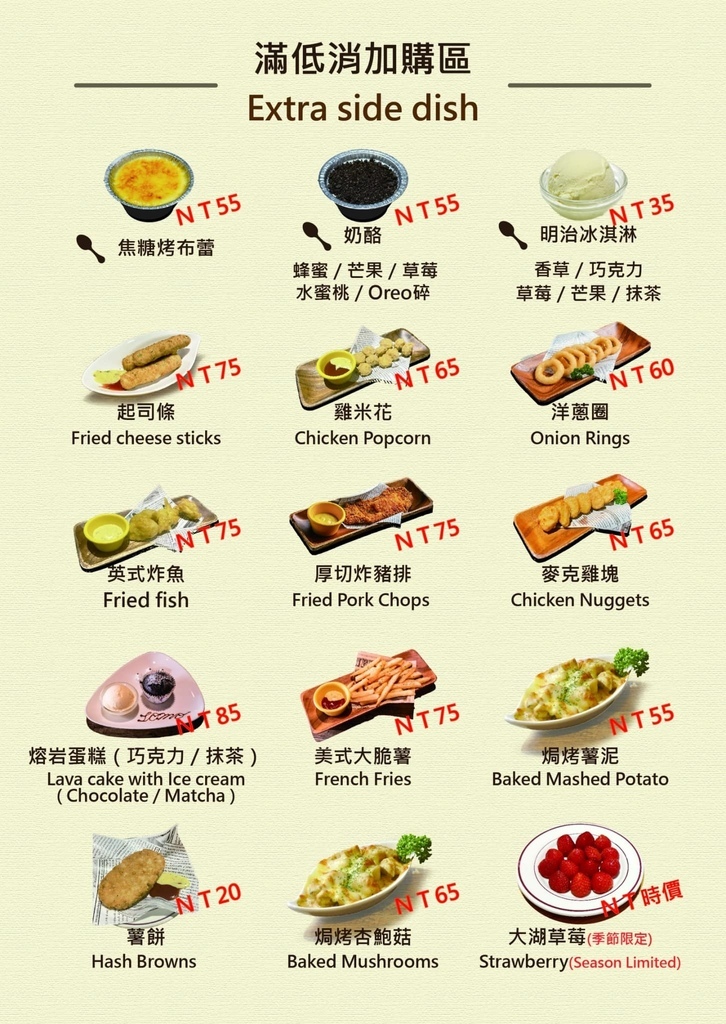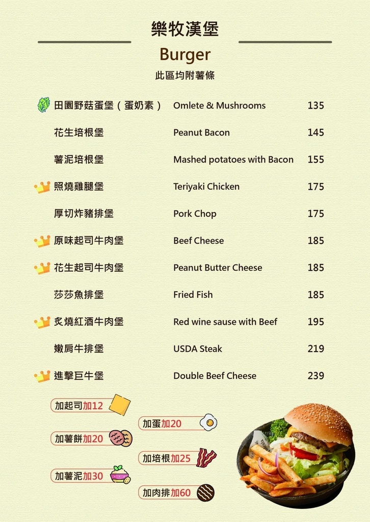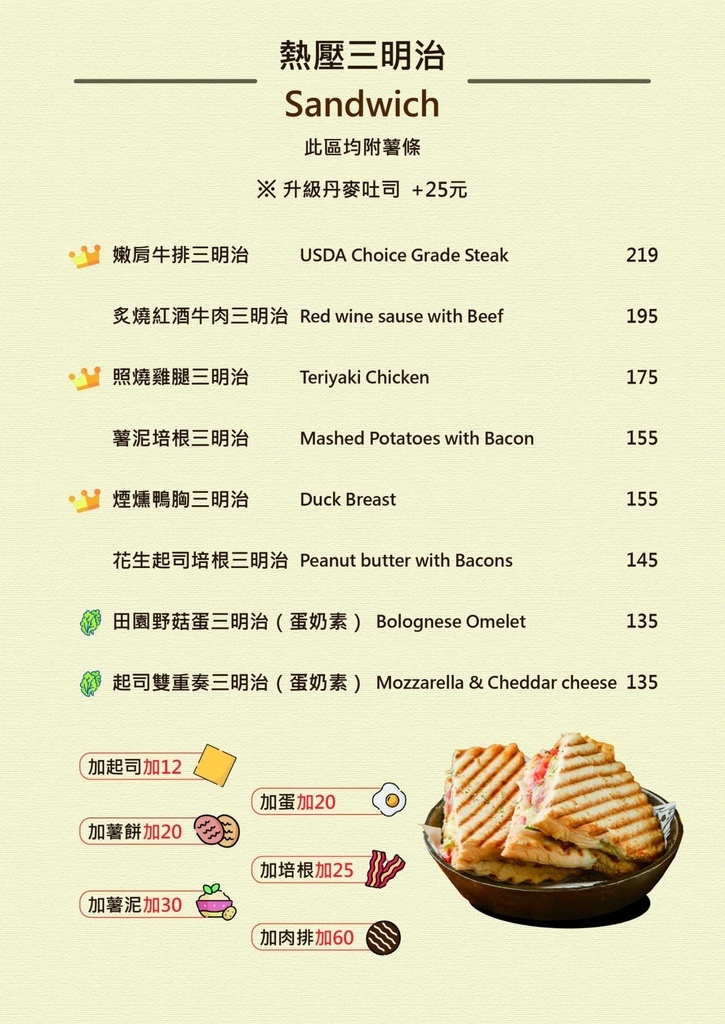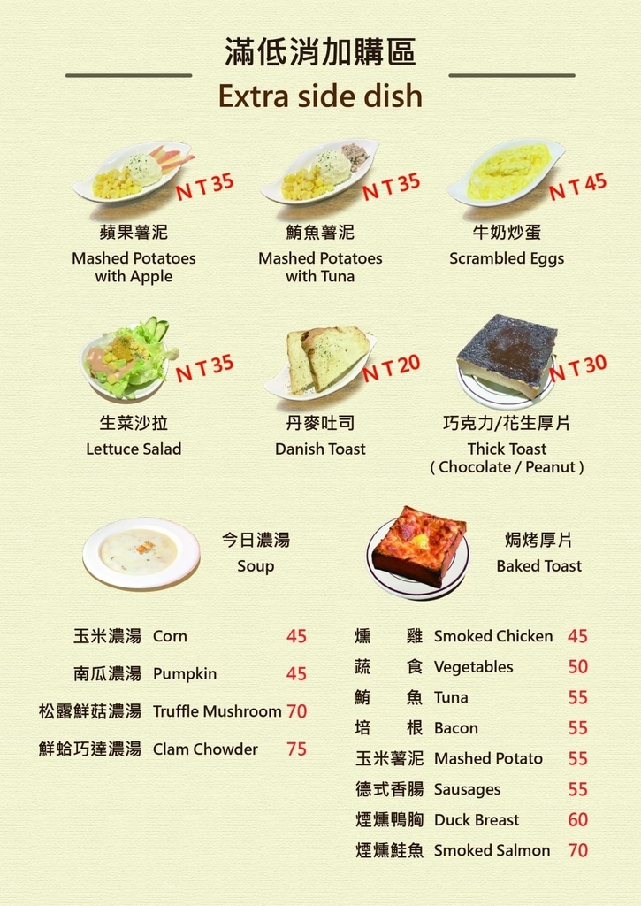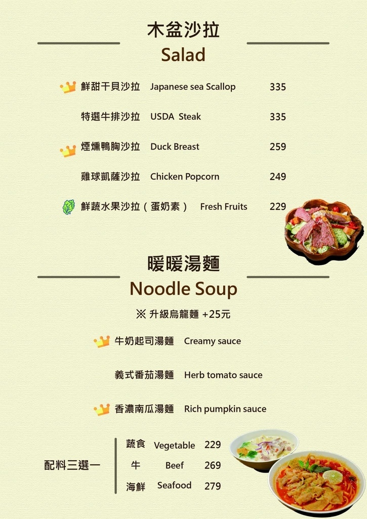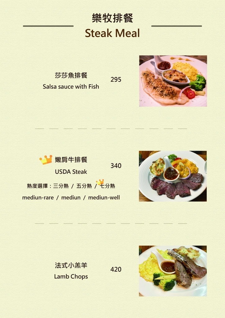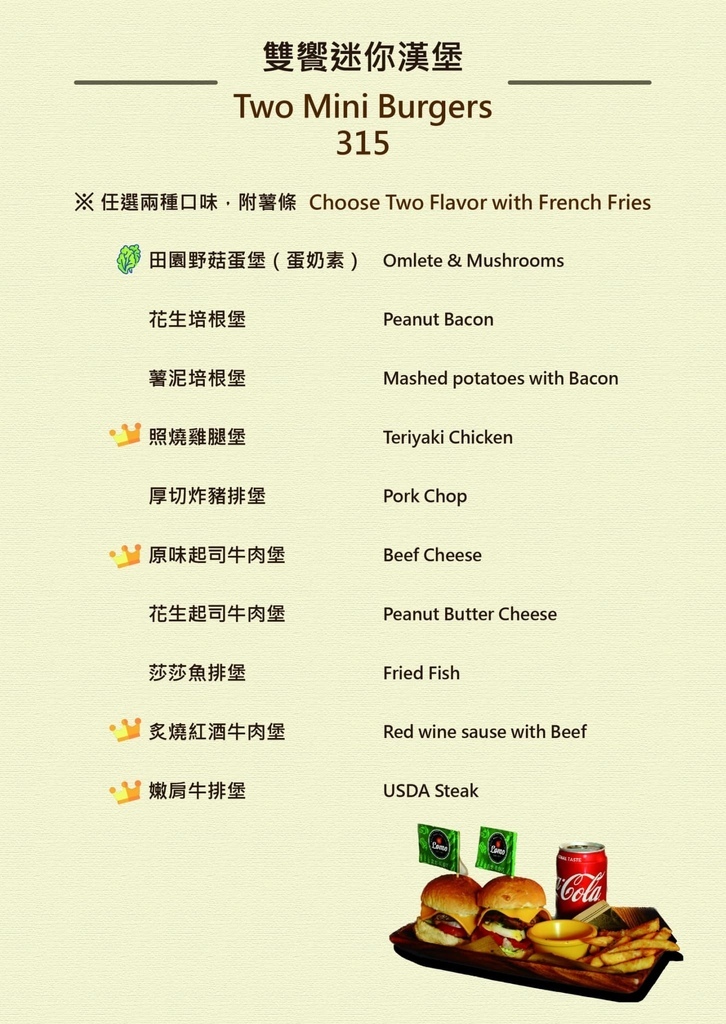 餐點大致有前菜/炸物/商業午餐/早午餐/三明治/漢堡/沙拉/湯麵/義大利麵/燉飯/排餐/甜點/飲料
