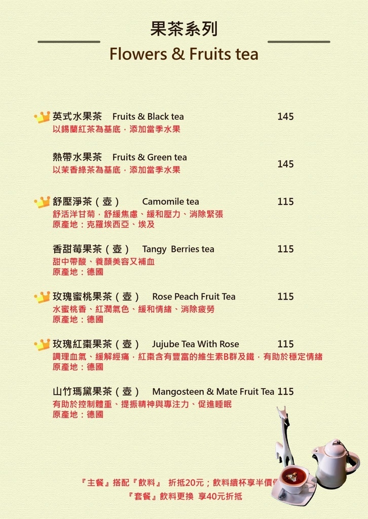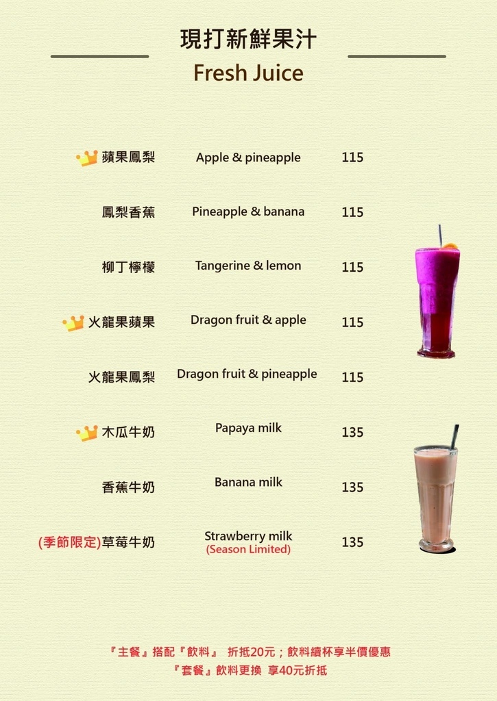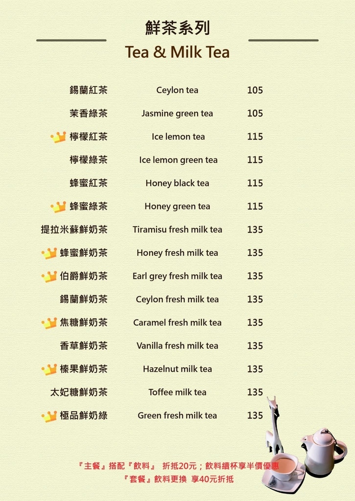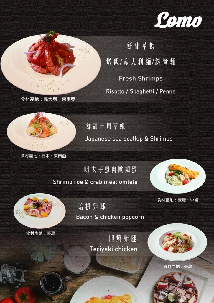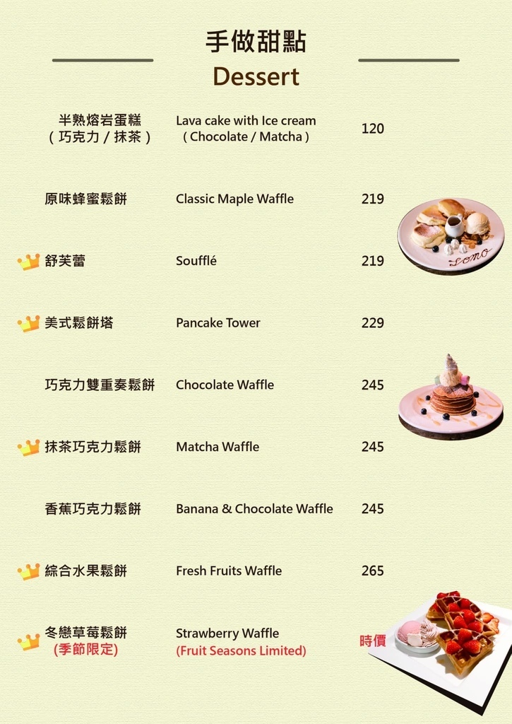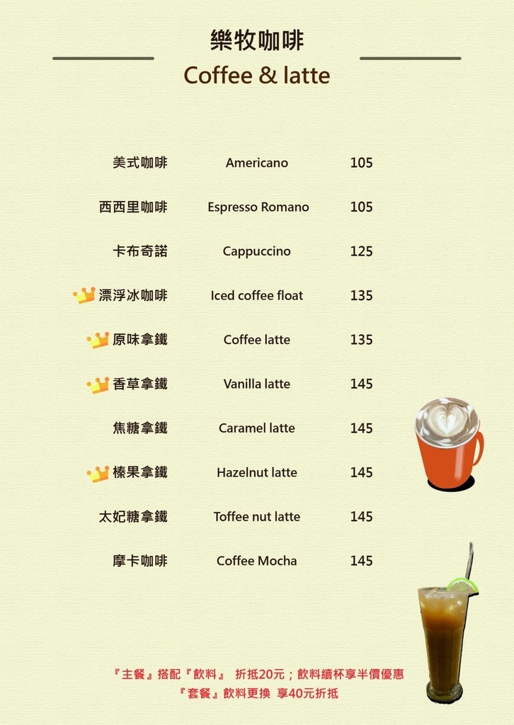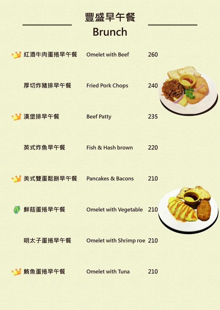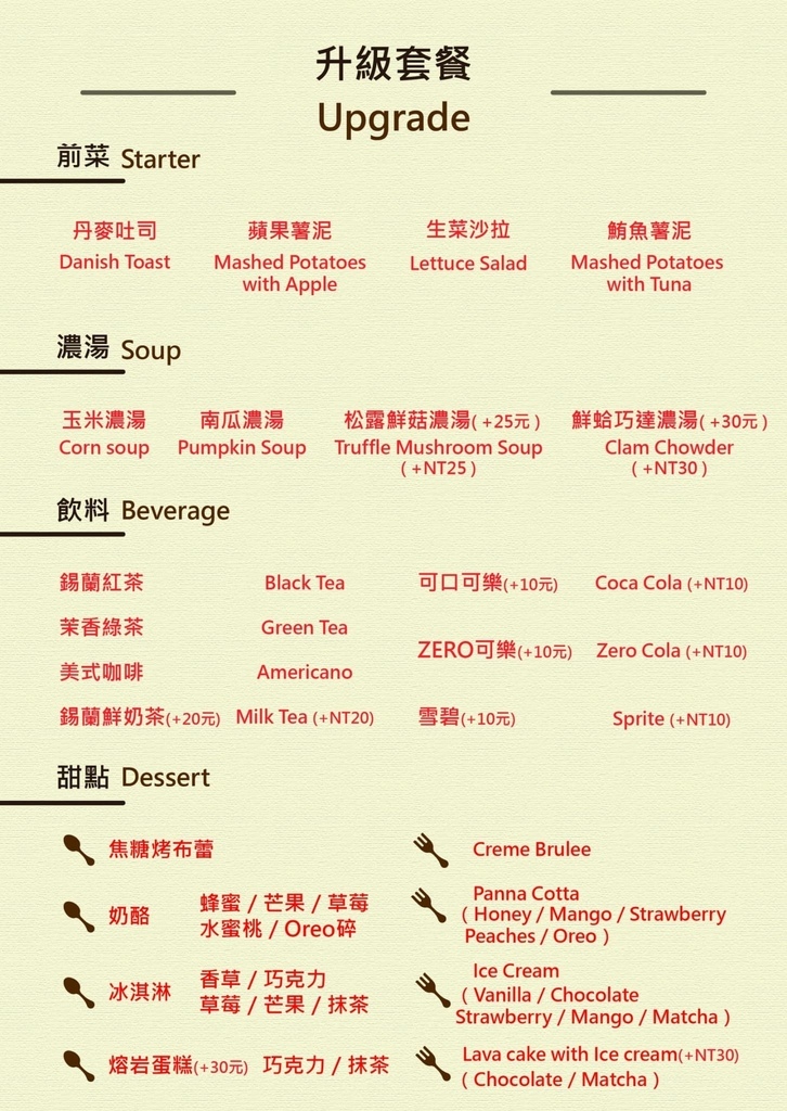 餐點大致有前菜/炸物/商業午餐/早午餐/三明治/漢堡/沙拉/湯麵/義大利麵/燉飯/排餐/甜點/飲料