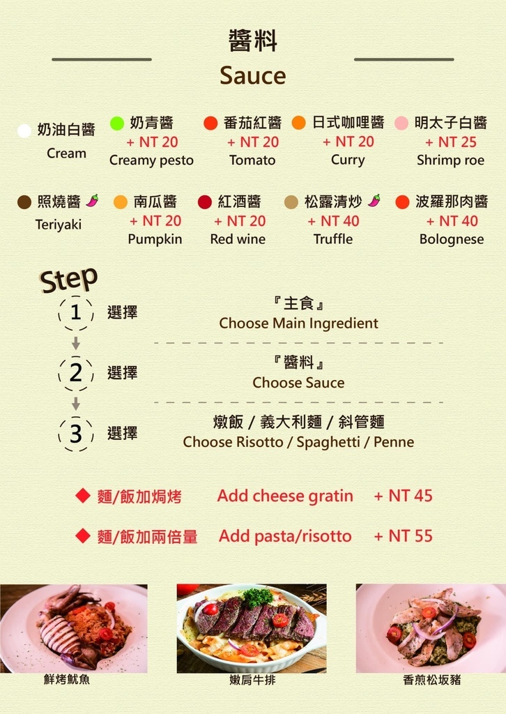 奶青醬/南瓜醬/番茄紅醬/紅酒醬 需+15元