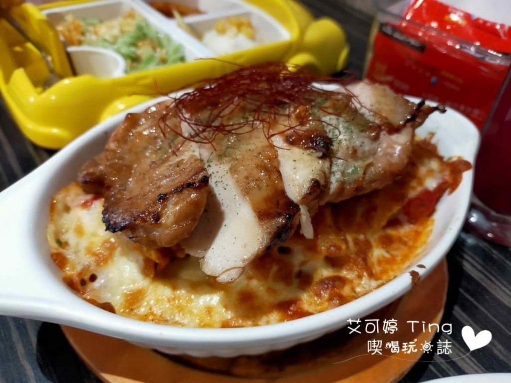 友人點的【照燒雞腿筆管麵+紅醬+焗烤】-315元,份量不少~