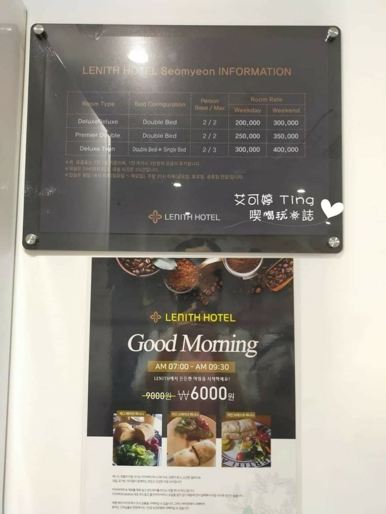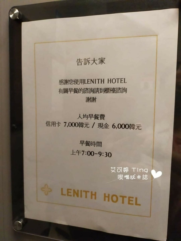 一樓看到電梯的右手邊是吃早餐的地方,供應時間07:00~09:30,早餐費-信用卡:7000韓元 / 現金:6000韓元
