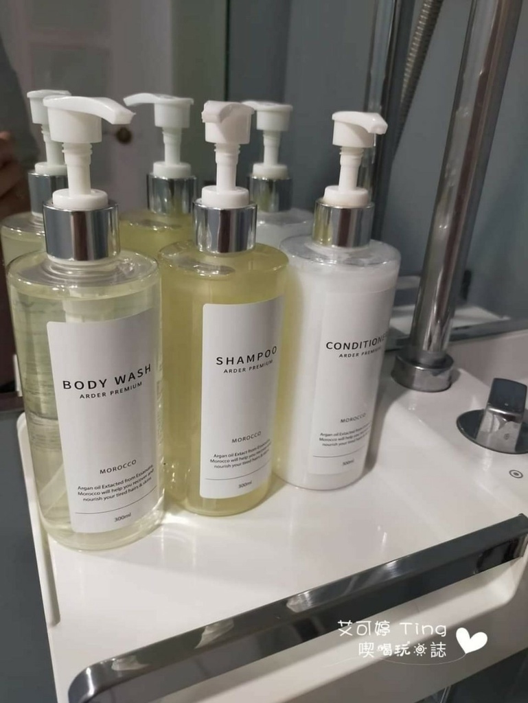 過了那一道門後的左手邊是浴室,有花灑跟蓮蓬頭,也有提供沐浴乳、洗髮乳、潤髮乳,沒想到還有不小的浴缸,