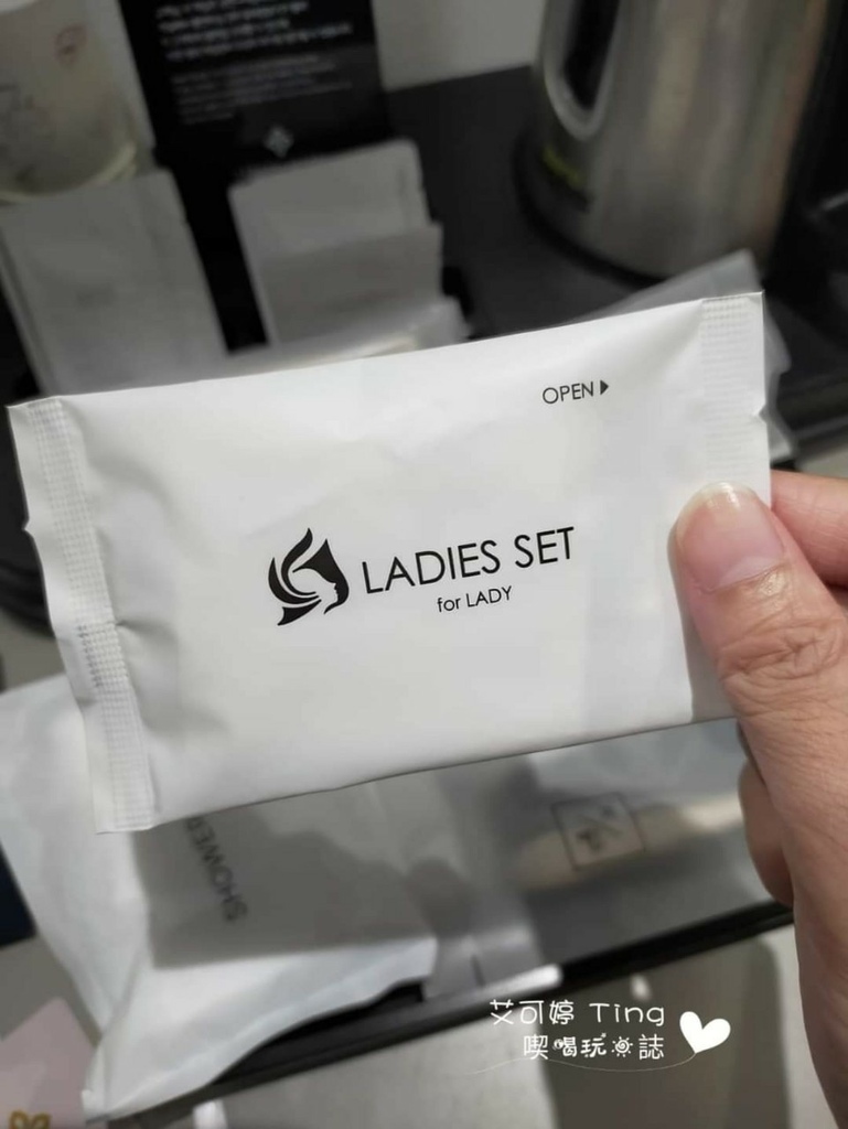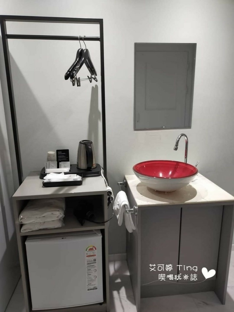 洗手台旁邊放衣架,但說真的這高度也不適合掛什麼衣服,還有熱水壺、備品(牙刷、牙膏、刮鬍刀、梳子都有)