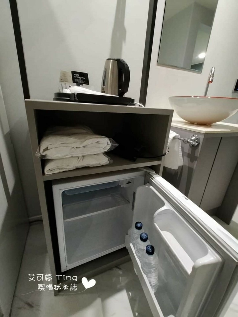 下方還有吹風機跟冰箱,冰箱裏面有附寶特瓶水
