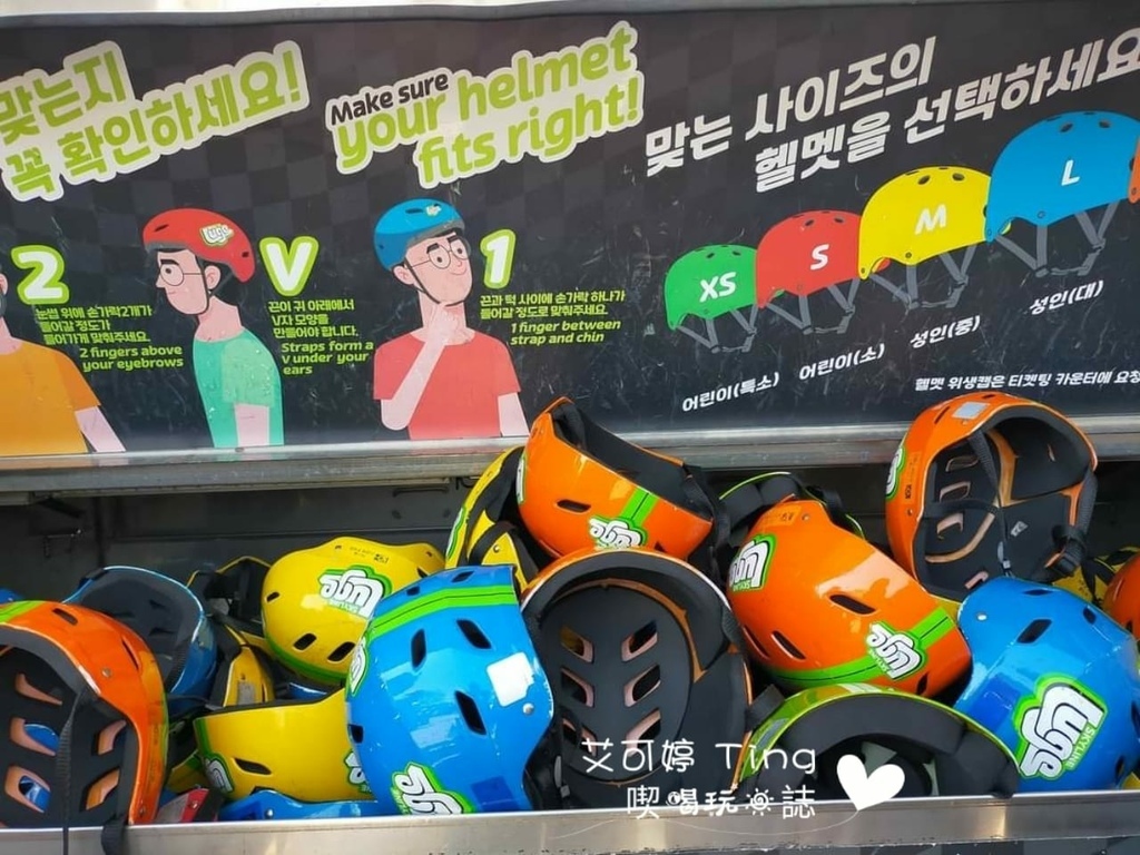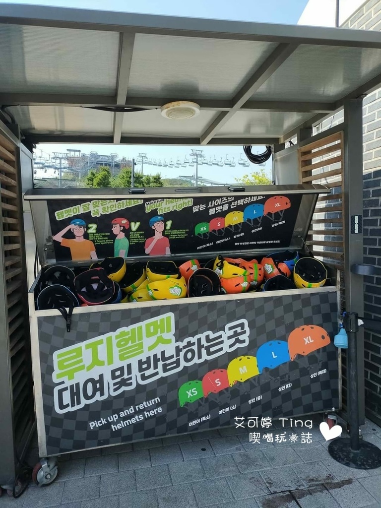 售票處兌換票/買好票之後,就到這區挑選適合的安全帽,每個顏色各代表不同尺寸的安全帽,要先佩戴好,才可以繼續往前搭乘空中纜車
