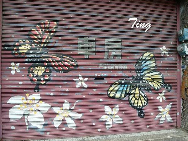 在走快到車站的前的中正路上,有戶人家的車庫的彩繪