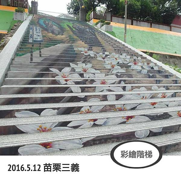 階梯由下往上看可看到油桐花、石虎、勝興車站及蒸汽火車等代表三義的各種元素