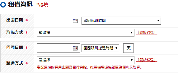 【出國/回國日期】【出國/回國航班時間】【取機/歸還方式】【目的地及城市】