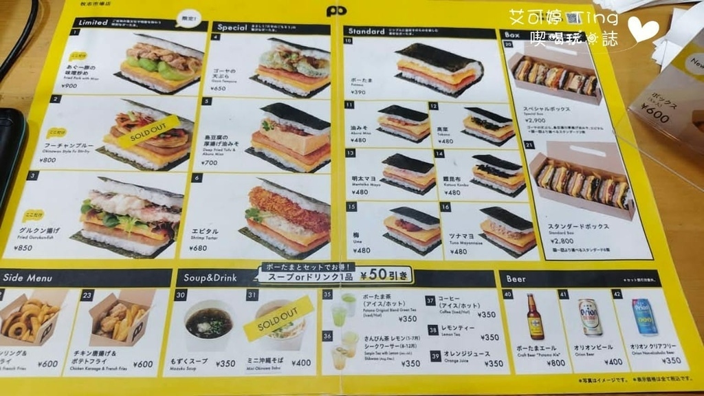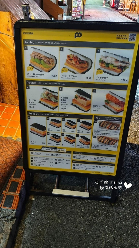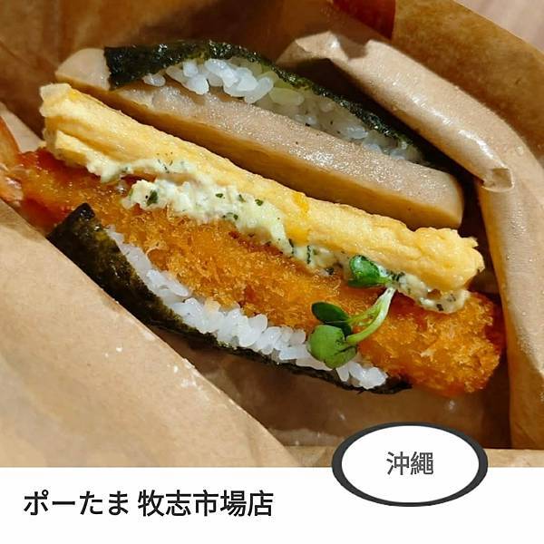 在沖繩特有的飯糰,主要是由午餐肉+玉子燒再包裹白飯與海苔,再延伸加入明太子蛋黃醬、鮪魚蛋黃醬、炸蝦塔塔醬、味噌炒豆腐等做口味變化