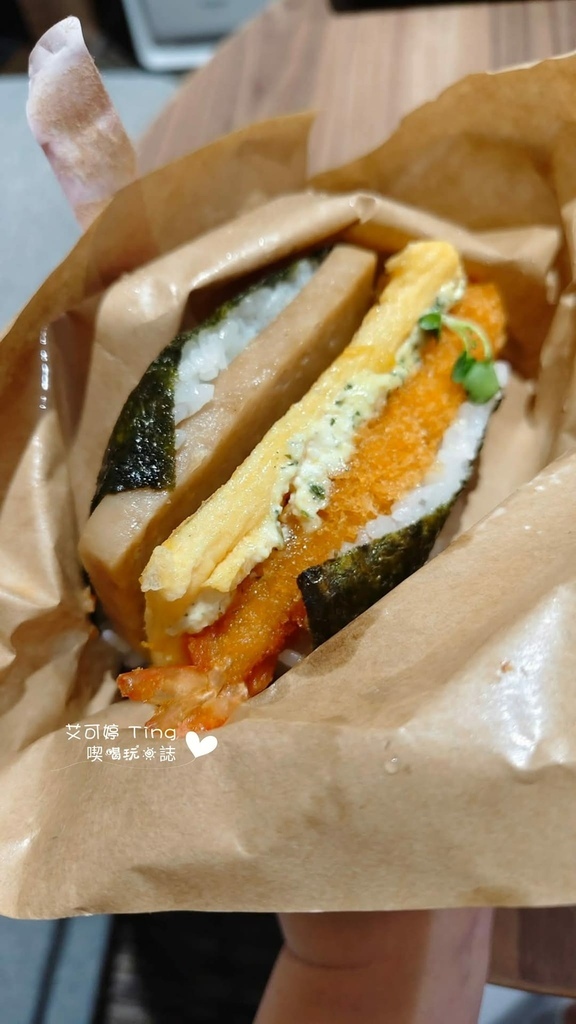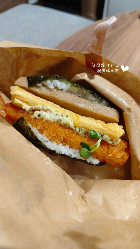 點了炸蝦塔塔醬口味(エビタル)的飯糰-680日幣,Q彈蝦肉配上塔塔醬,滑順的玉子燒,主要調味在於午餐肉,