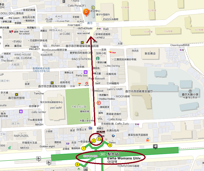 地鐵:241【梨大站】2、3號出口直走