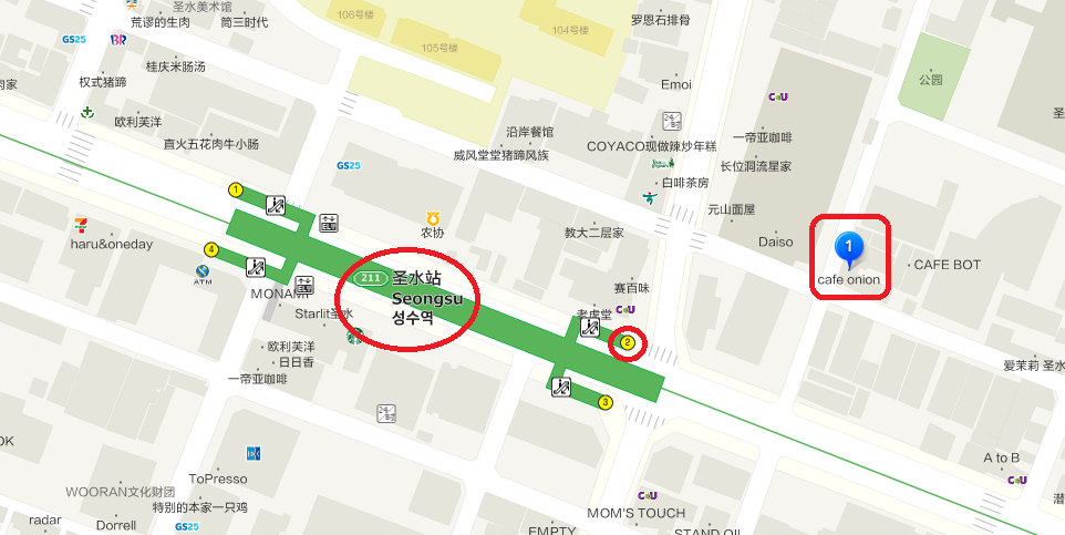 地鐵:2號線 211【聖水站 성수역】2號出口,步行2-3分鐘