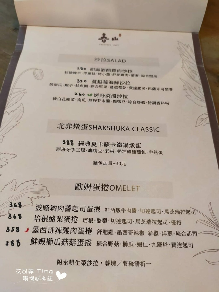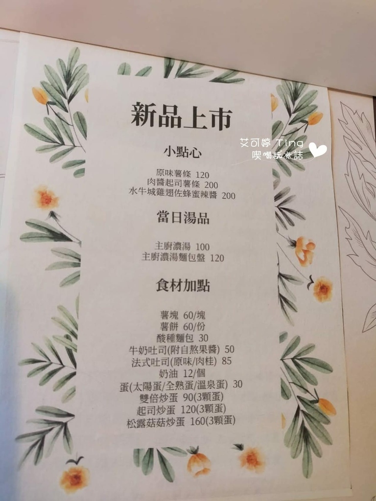 餐點有早午餐盤、義大利麵、燉飯、沙拉、歐姆蛋捲、飲品,還有新上市的小點心類,