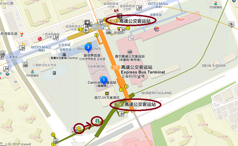 地鐵:339/734/923【高速巴士客運站 고속터미널역】4號出口出來直走即可