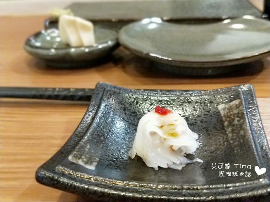 小花枝,上面紅色的是日本梅肉醬,吃起來口感帶點黏黏滑滑且QQ的
