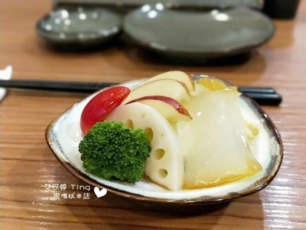 有蘋果、番茄、花椰菜、蓮藕及曼波魚的皮組合起來的沙拉,搭配酸酸的醬汁真的是蠻清爽的