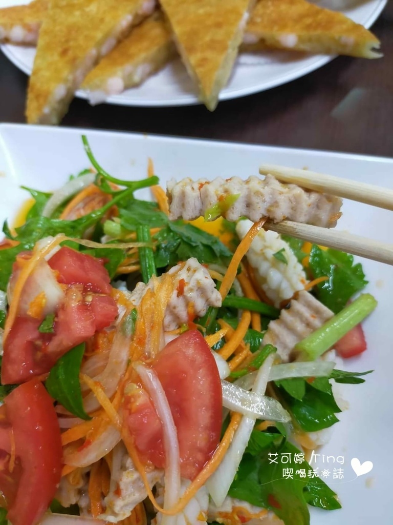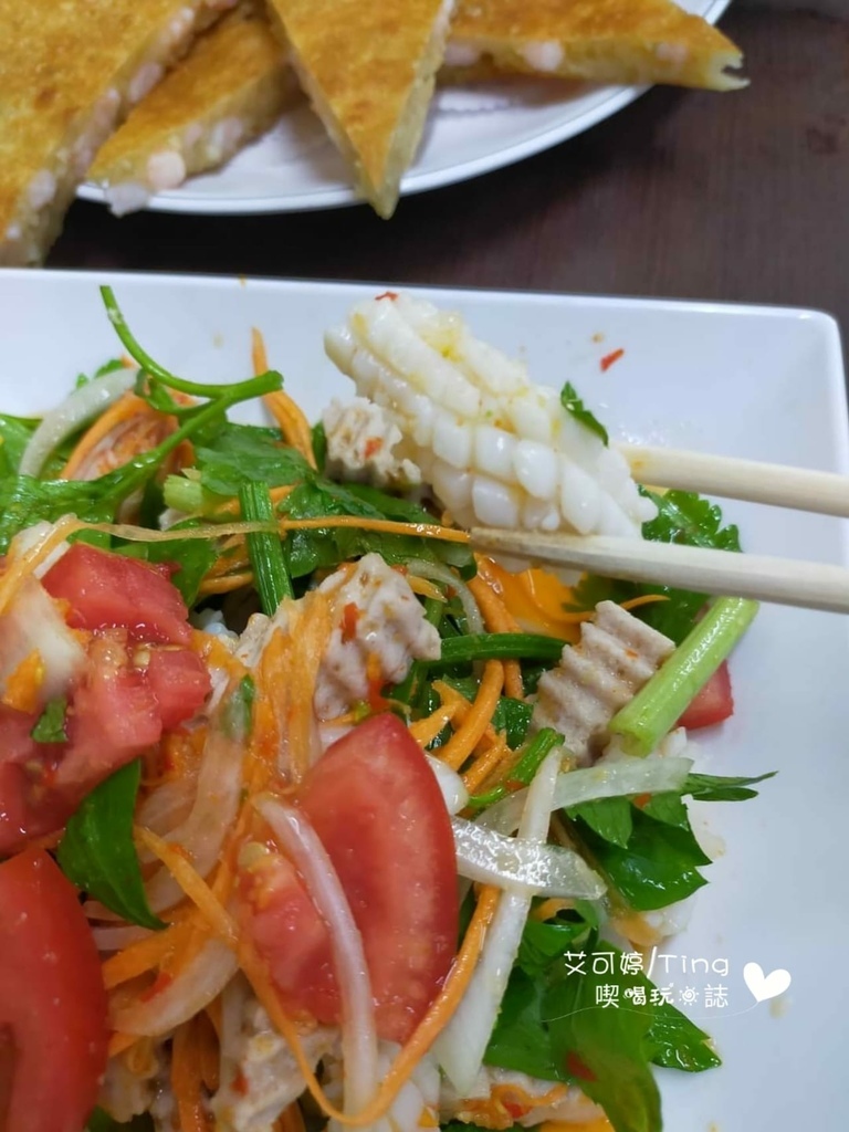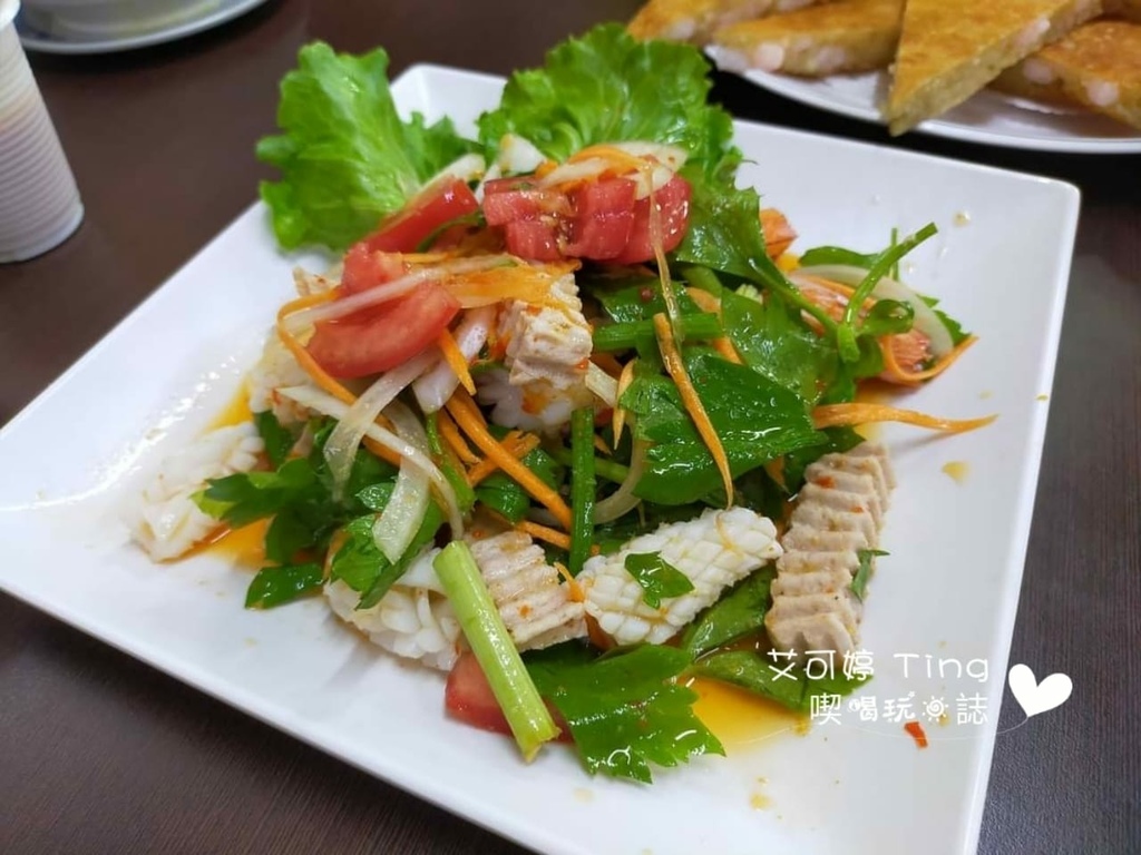 【涼拌什錦】-250元,除了番茄、花枝、火腿等,還有蝦子,吃起來清爽開胃