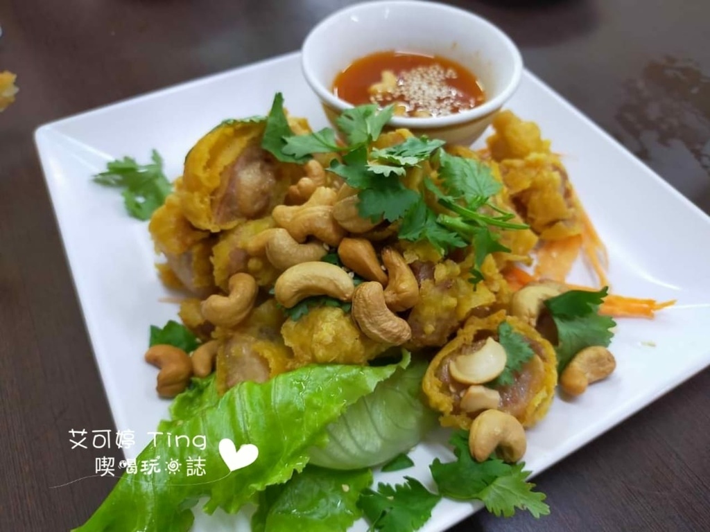 【椒麻雞】-200元,第一次看到椒麻雞有使用堅果,椒麻雞炸得酥脆,也是第一次看到這種炸法,