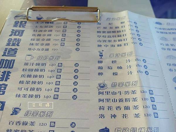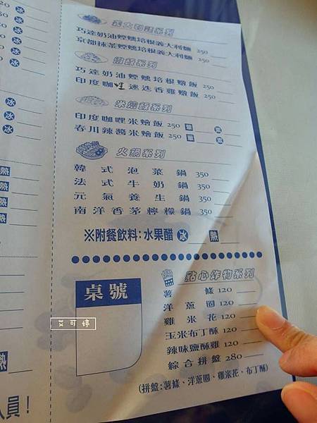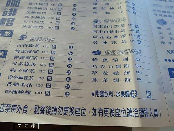 提供咖啡、撞奶、綠茶、氣泡飲、果汁、熱茶、甜點鬆餅、義大利麵、燉飯、米燴飯、火鍋