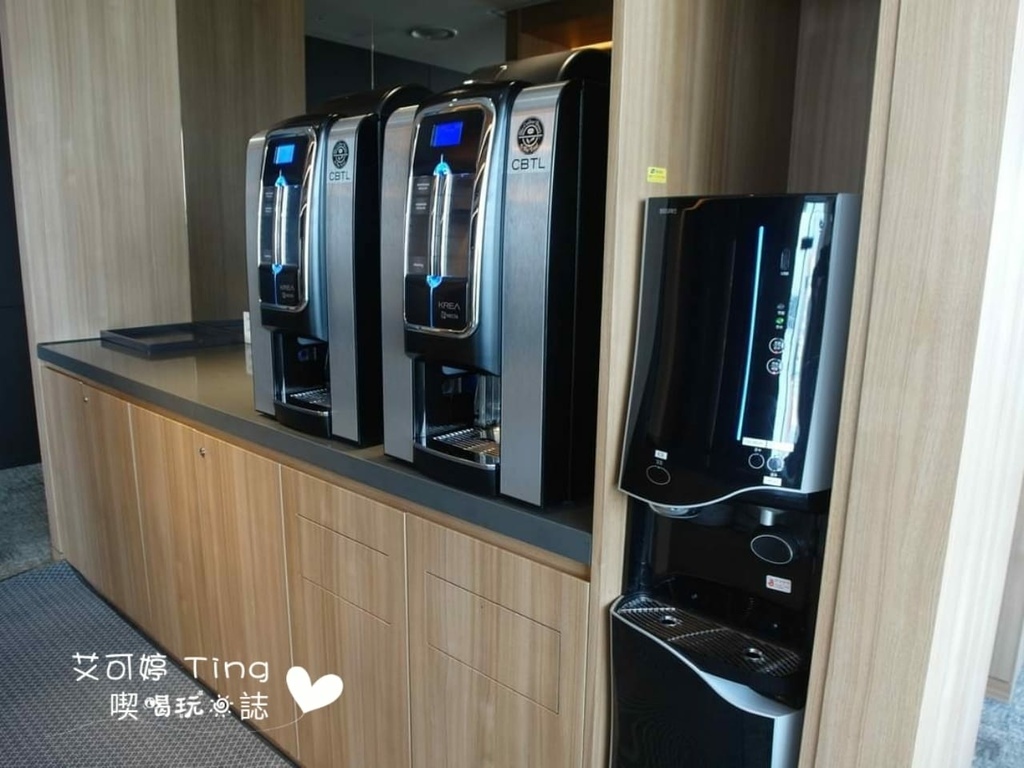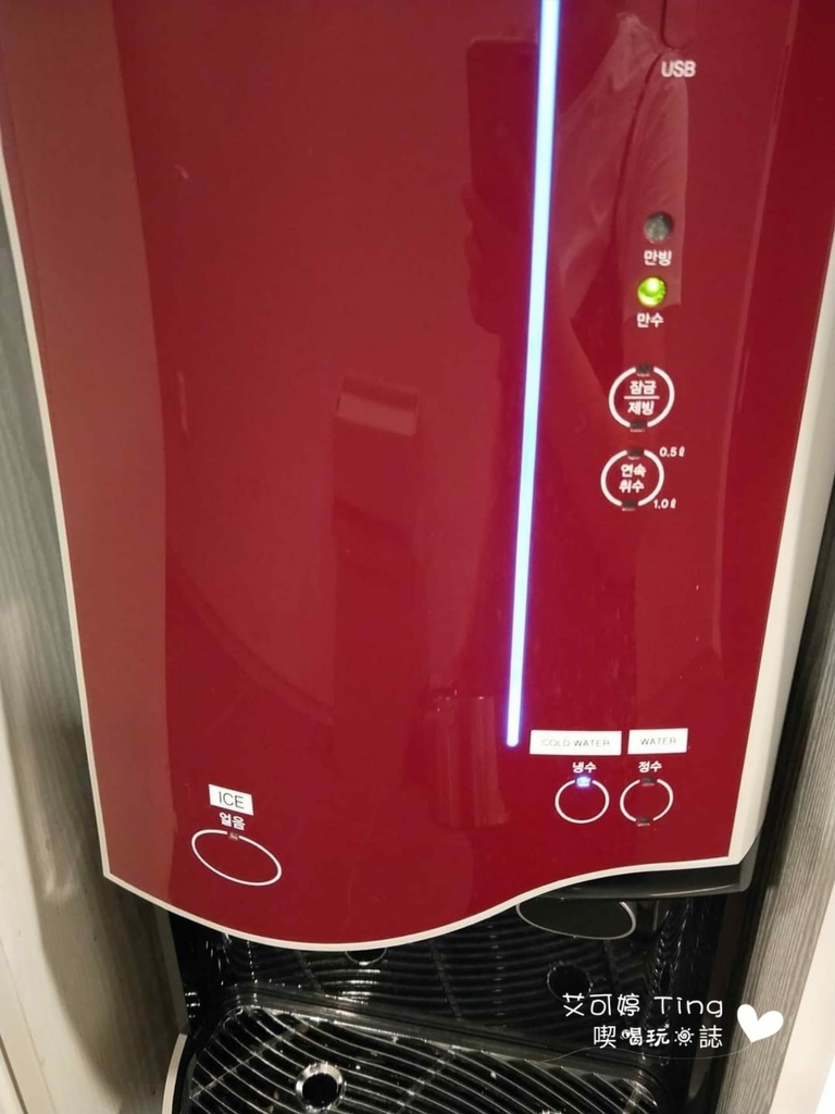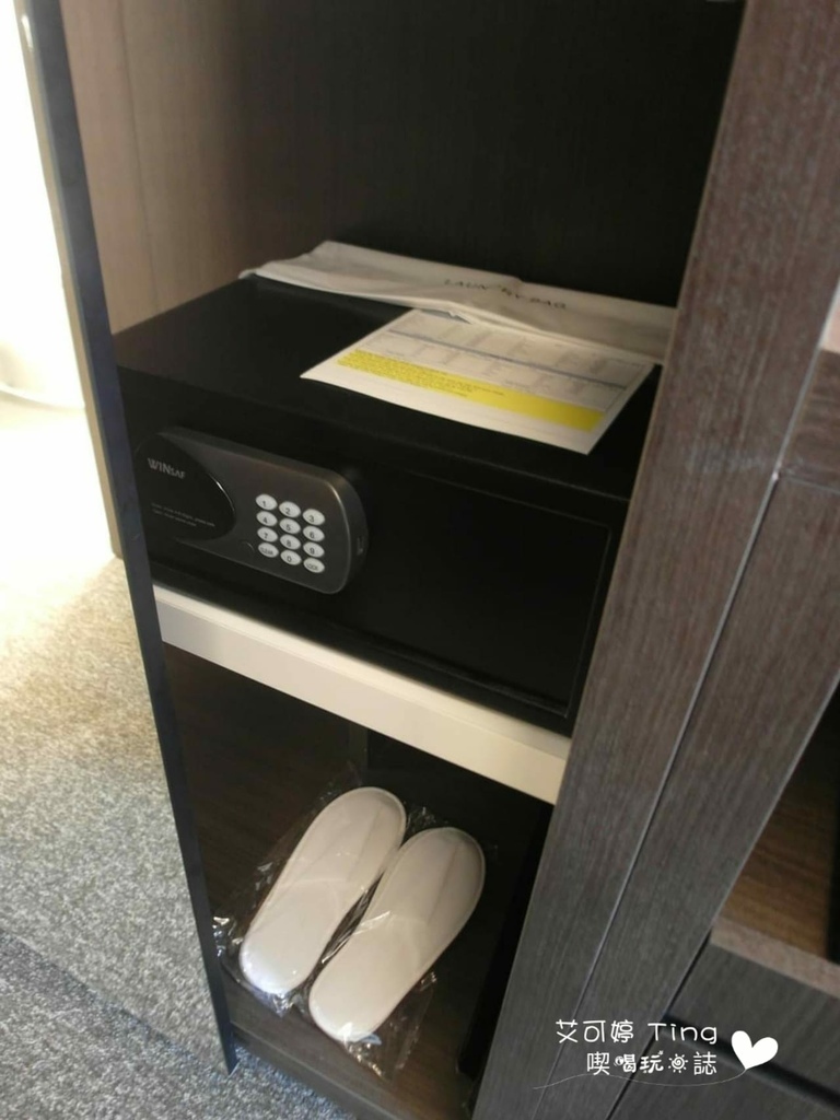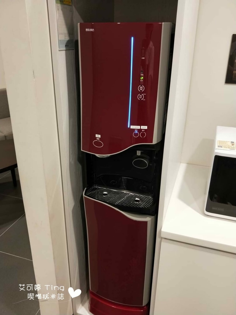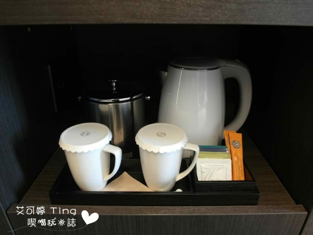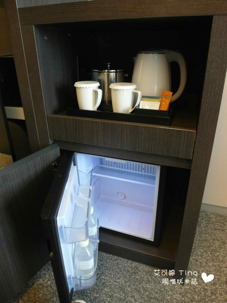 提供熱水壺、杯子、茶包,下方還有小冰箱