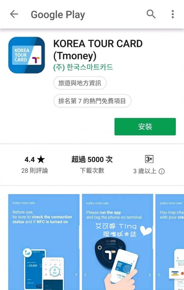 點開Google Play商店打「Korea Tour Card」下載並安裝