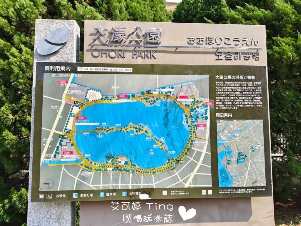 公園內及附近有日本庭園、湖中踩鴨仔船、兒童遊樂設施及福岡市美術館,甚至有八女茶專賣店「&LOCALS」、星巴克等,