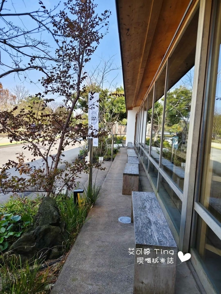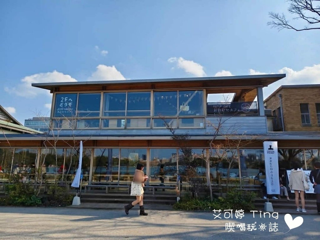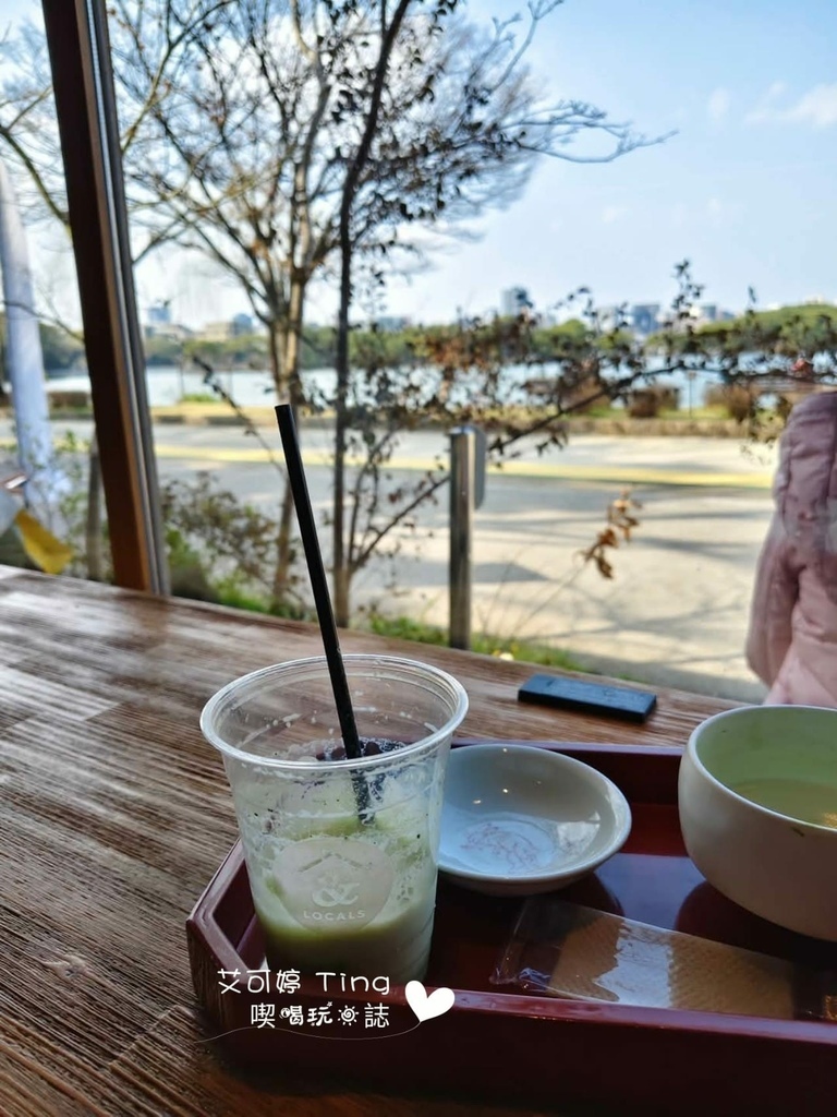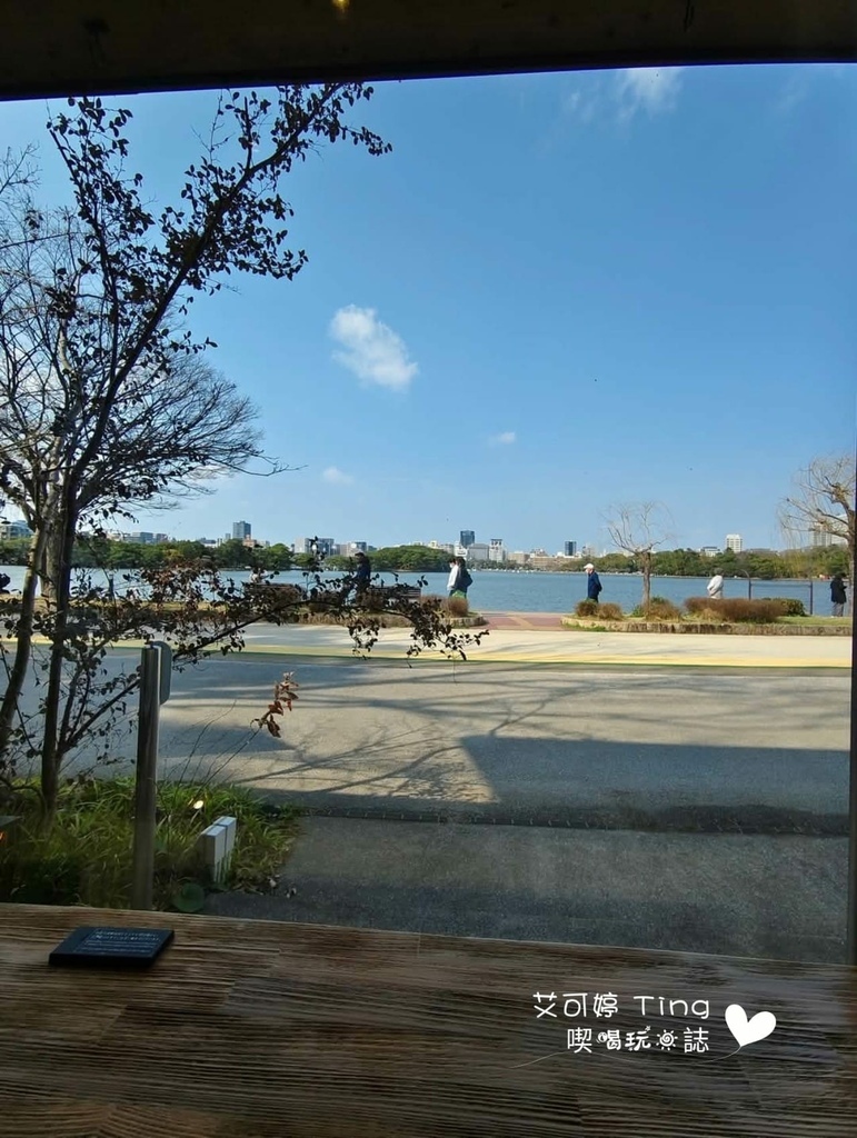日式木造雙層建築,面向湖側都使用了落地窗,可以看到大濠公園湖岸風景