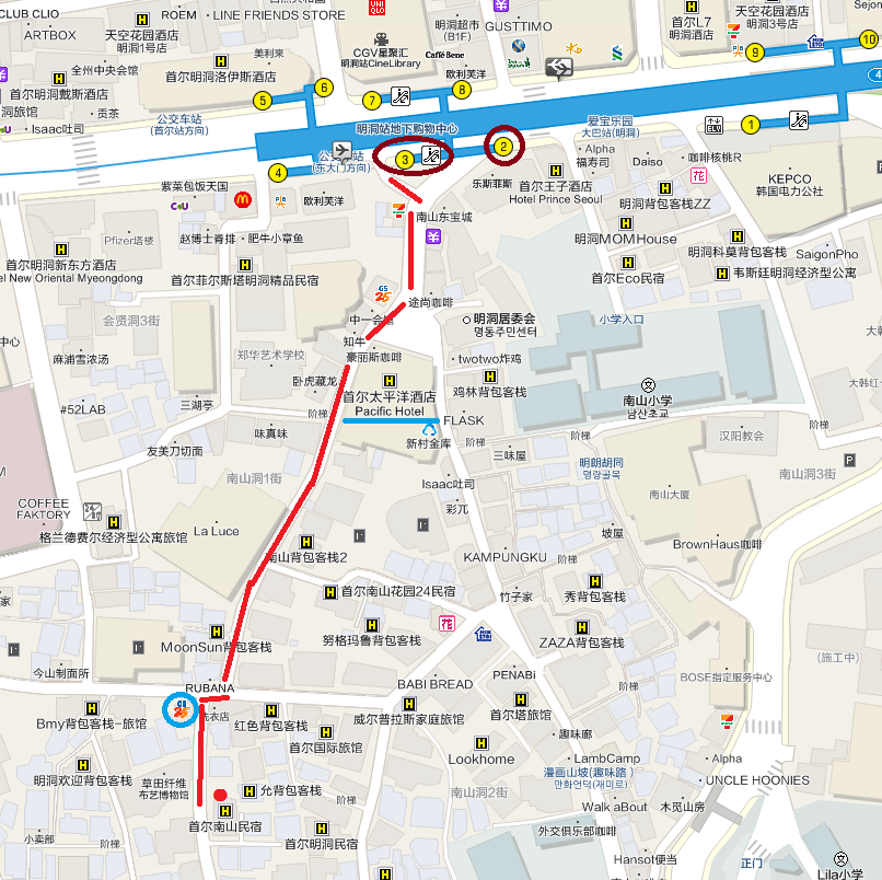 地鐵:4號線 424【明洞站】2、3號出口(3號有小手扶梯可搭)