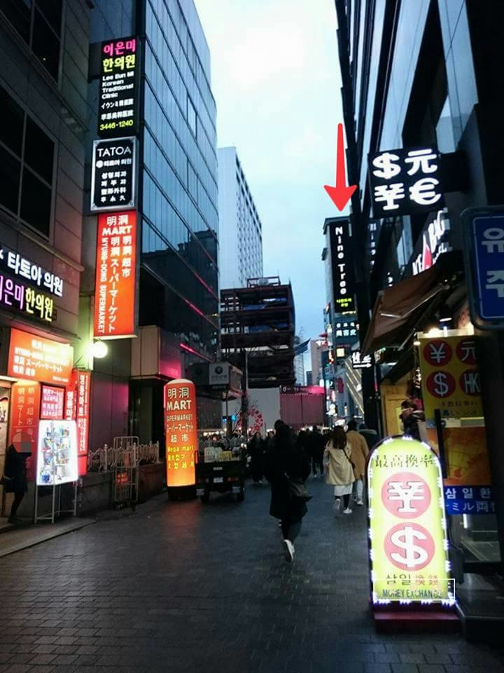 左手邊紅紅的標示(明洞超市),再往前走沒幾步路就到了
