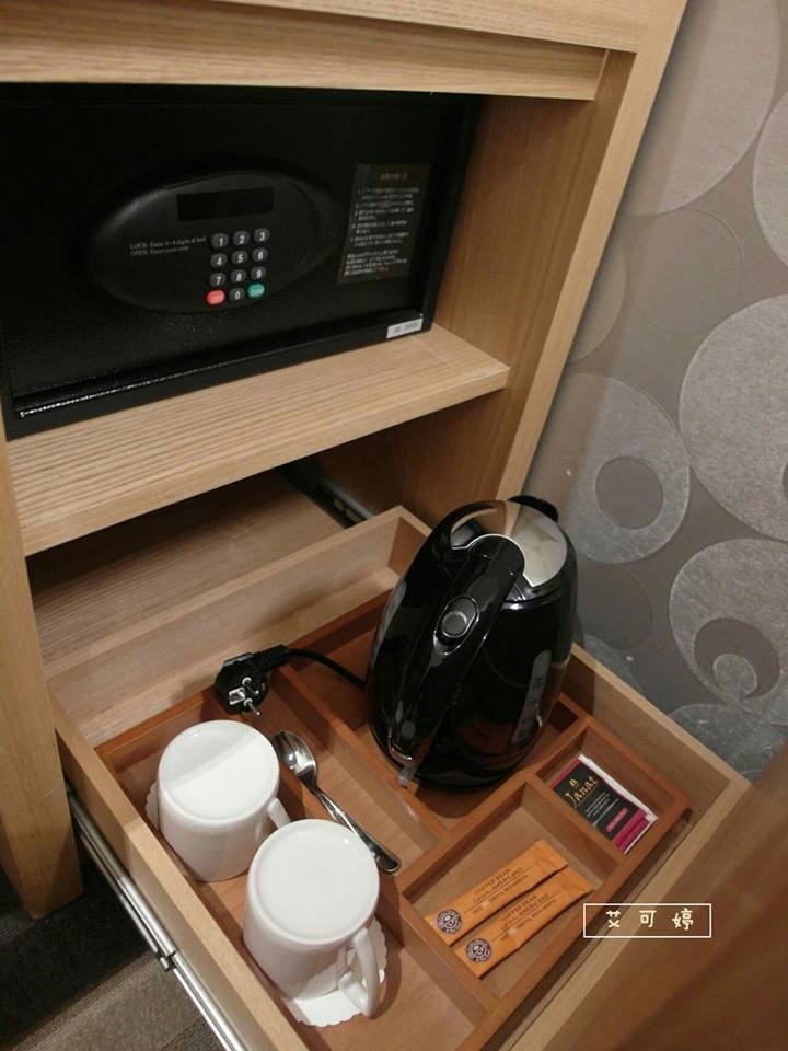 桌子另一邊是保險箱、杯子、熱水壺、茶包