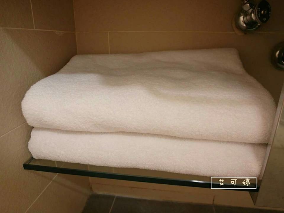 洗手台下方放著大毛巾及備用衛生紙和吹風機