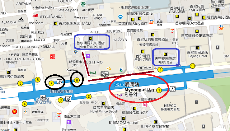 所以可以選擇7號出口比較輕鬆囉~這次因為前幾天住空中花園3,在明洞的9號出口,