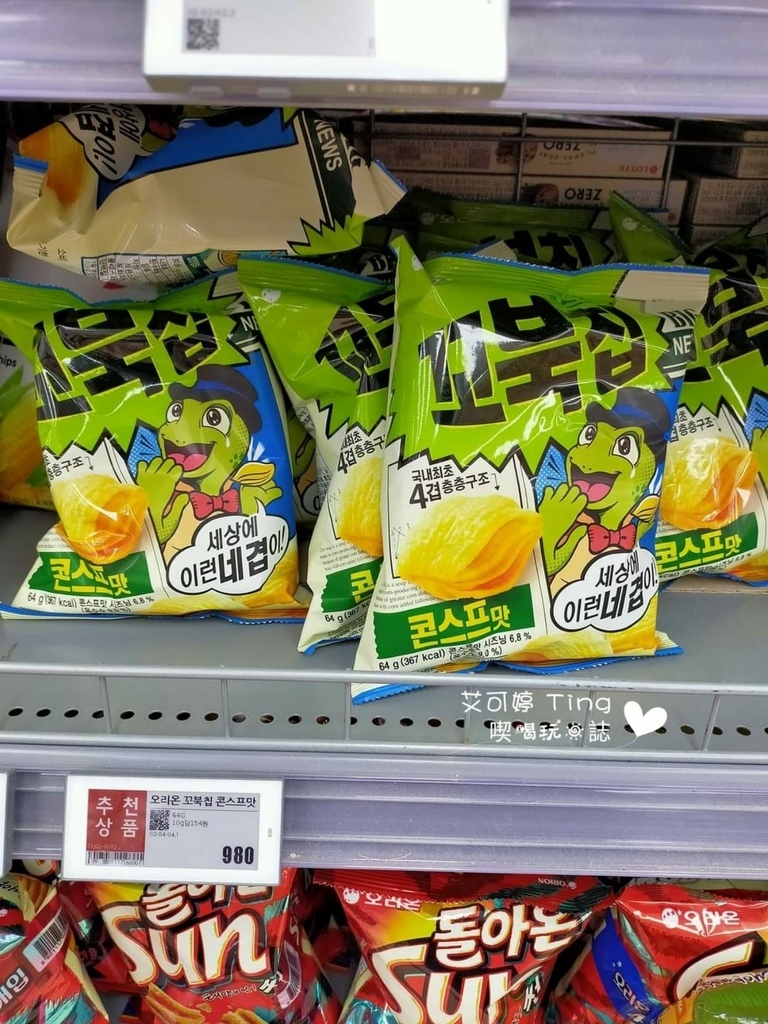 【꼬북칩】-980韓元,造型像烏龜,最有名的就是玉米濃湯口味的,好吃