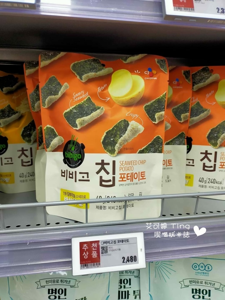 【Bibigo的海苔餅乾】-2480韓元,馬鈴薯口味,海苔外面包裹著一層薄麵皮,口感酥脆