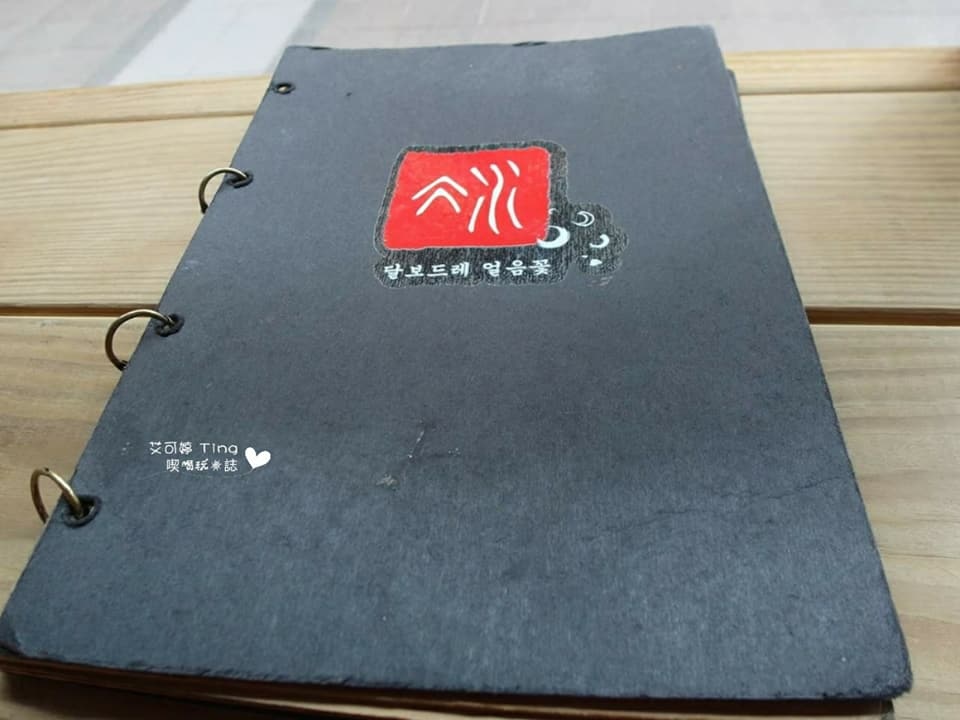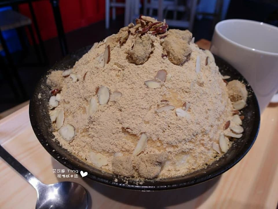 使用韓國道地黃豆粉,配上黑糖麻糬、杏仁片,再淋上煉乳