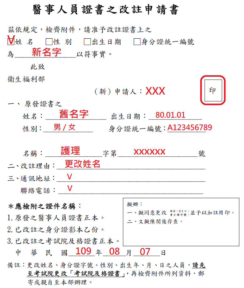 及格證書改註完成後,準備上述的資料再寄送或親送至衛生福利部醫事司