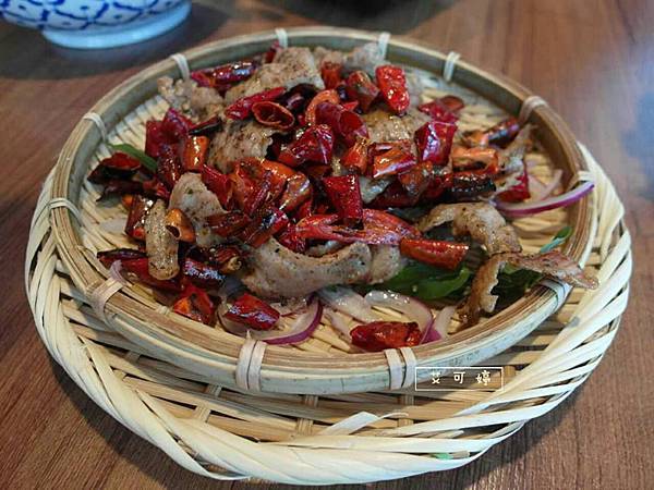 以大紅辣椒、花椒、孜然拌炒,香氣十足,好吃倒沒什麼辣度