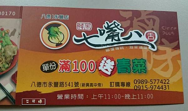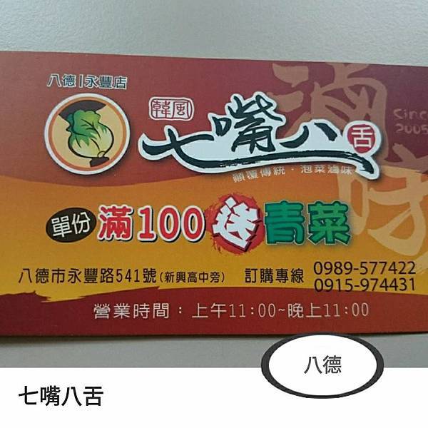 紀錄一下工作附近吃的店,好不好吃看個人喔。 七嘴八舌(永豐店) 地址:桃園市八德區永豐路541號(新興高中旁) 訂購電話:0989-577-422、0915-974-431 時間:11:00-23:00 公休:無固定 其他:滿300元可外送提前預訂、單份滿100元送青菜 官網:七嘴八舌泡菜滷味 之前上班同事就有幫忙買過,平時也不是很常吃滷味,今天就自己來買 經過永豐高中後再繼續走,在新興高中旁 開始自己夾想吃的囉 裡面還有提供內用座位 斜對面是85度C跟超市 名片 位置: 檢視較大的地圖