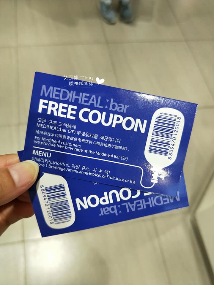 幫朋友買﹝MEDIHEAL ﹞面膜,結帳後還有送兩張券,可以上二樓喝點免費的咖啡或飲料